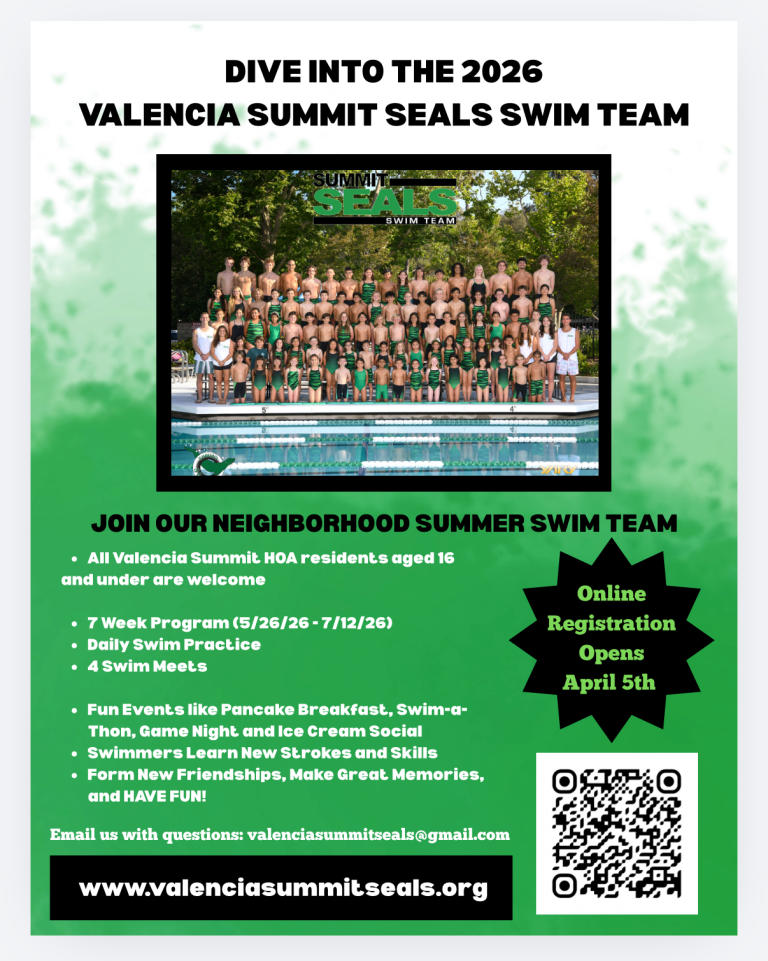 * The Summit Swim Team Program is open to all Valencia Summit HOA residents aged 16 and under (including The Stratfords). All NEW swimmers regardless of age are required to show swim competency for their health and safety.